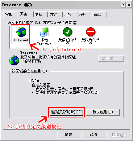 在打开的《Internet选项》窗口中,点击《安全》按钮,出现如下图所示内容,按图操作: